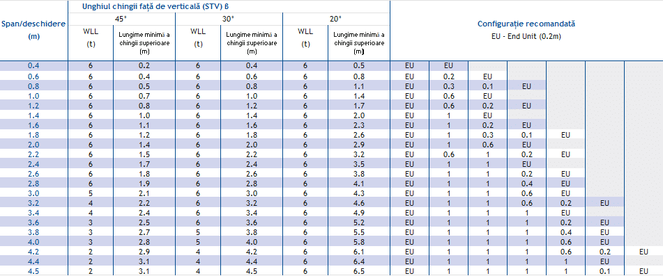 Tipuri de chingi recomandate: Recomandăm utilizarea chingilor textile, cabluri metalice cu ochiuri moi sau dispozitive cu lanț cu lungimile minime din tabelul de mai sus.